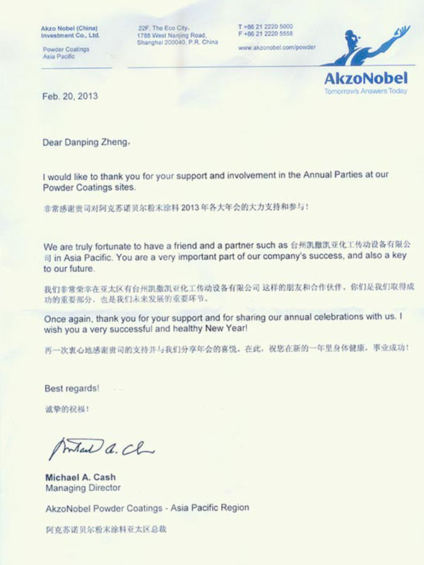 台州凯撒凯亚化工传动设备有限公司致力于化工粉末设备的研究制造。主要产品为各种规格的粉末涂料生产设备,包括容器混合机,单、双螺杆挤出机,冷却带,碾磨机组(ACM磨)。公司已与国外多个世界顶级公司“AKZO NOBEL集团""PPG集团”、"老虎涂料集团”、“南宝树脂集团”、“杜邦集团”、“立邦集团”、"OXYPLAST集团”等建立了紧密:的合作伙伴关系,产品远销美国、德国、意大利及东南亚广大市场,得到一致好评。